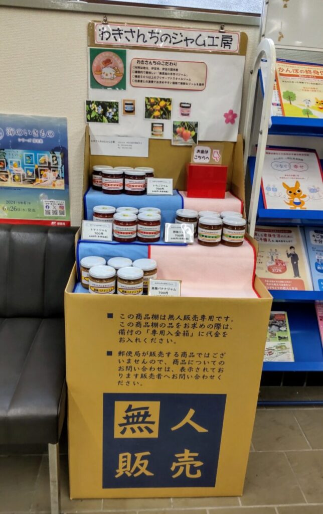 郵便局伊豆長岡駅前支店で無人販売を始めました。 投稿日:2024/07/03 郵便局内の無人販売コーナー 南条交差点近くの郵便局伊豆長岡駅前支店の構内に無人販売所を開設しました。郵便局をご利用の際に覗いてみてください。販売するジャムは時々入れ替えます。